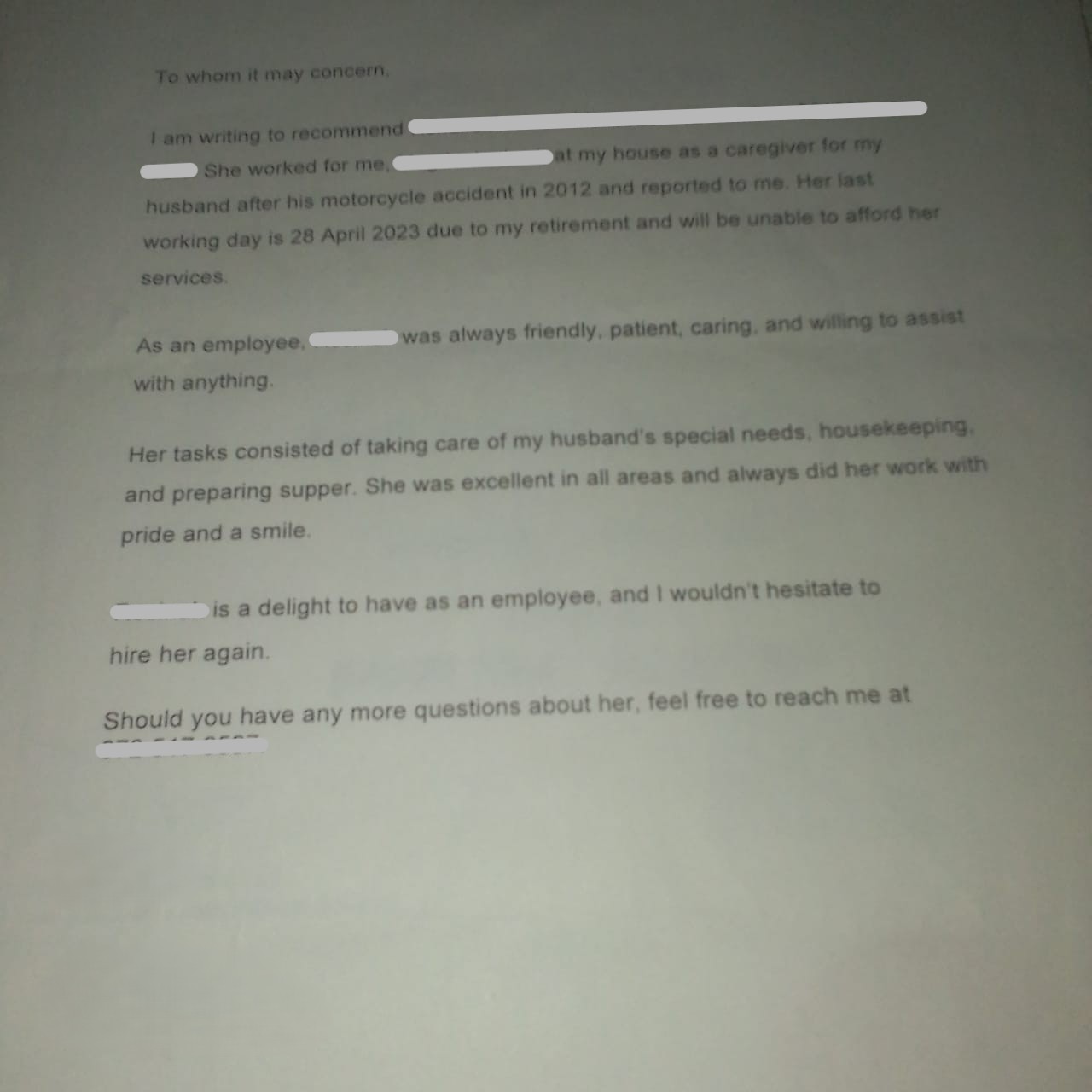 From Prvate family (1): This letter serves as a reference for RM who was employed by our family as a live-in-care giver for my mother from February 2024 to May 2026. Working with a loved one displaying continued signs of deterioration due to dementia is no easy task. During her time with my mother, RM showed true patience, commitment and drive. Her duties included assisting with personal care, administering medication as instructed, preparing meals, maintaining a clean and safe living environment, and providing companionship and emotional support. Her background and years of experience in working with the elderly shone through as her responsibilities were completed with care, patience and compassion. RM’s attention to detail, strong administrative skills and clear communication provided myself as well as my family with security in knowing our mother is well cared for. Her time with us, unfortunately came to an end as my mother is moving into a full-time care facility. With that her services can now be extended to new family who will without a doubt, benefit greatly. I would happily recommend RM to anyone in need of daily care and assistance. RM was a blessing to our family, and we would highly recommend her to be hired.