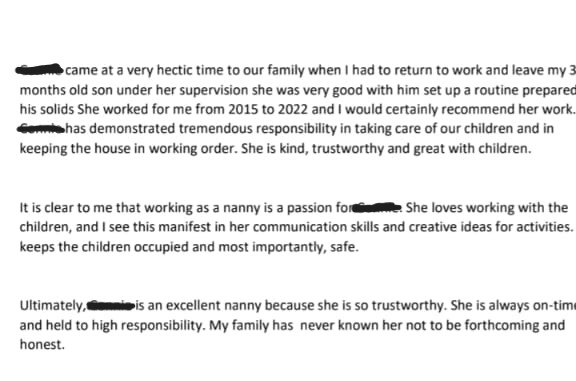 Additional info on CG’s reference: Employer confirmed that reference letter was written by them. They also confirmed that CG was in charge of their home; she was the mother of the house. Employer also confirmed that their child was all grown and they could no longer afford CG’s services. Otherwise, CG is amazing.