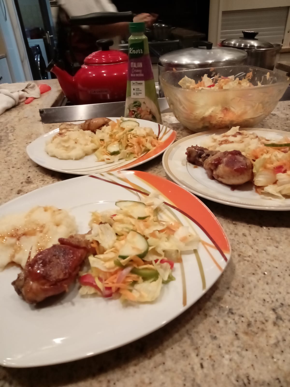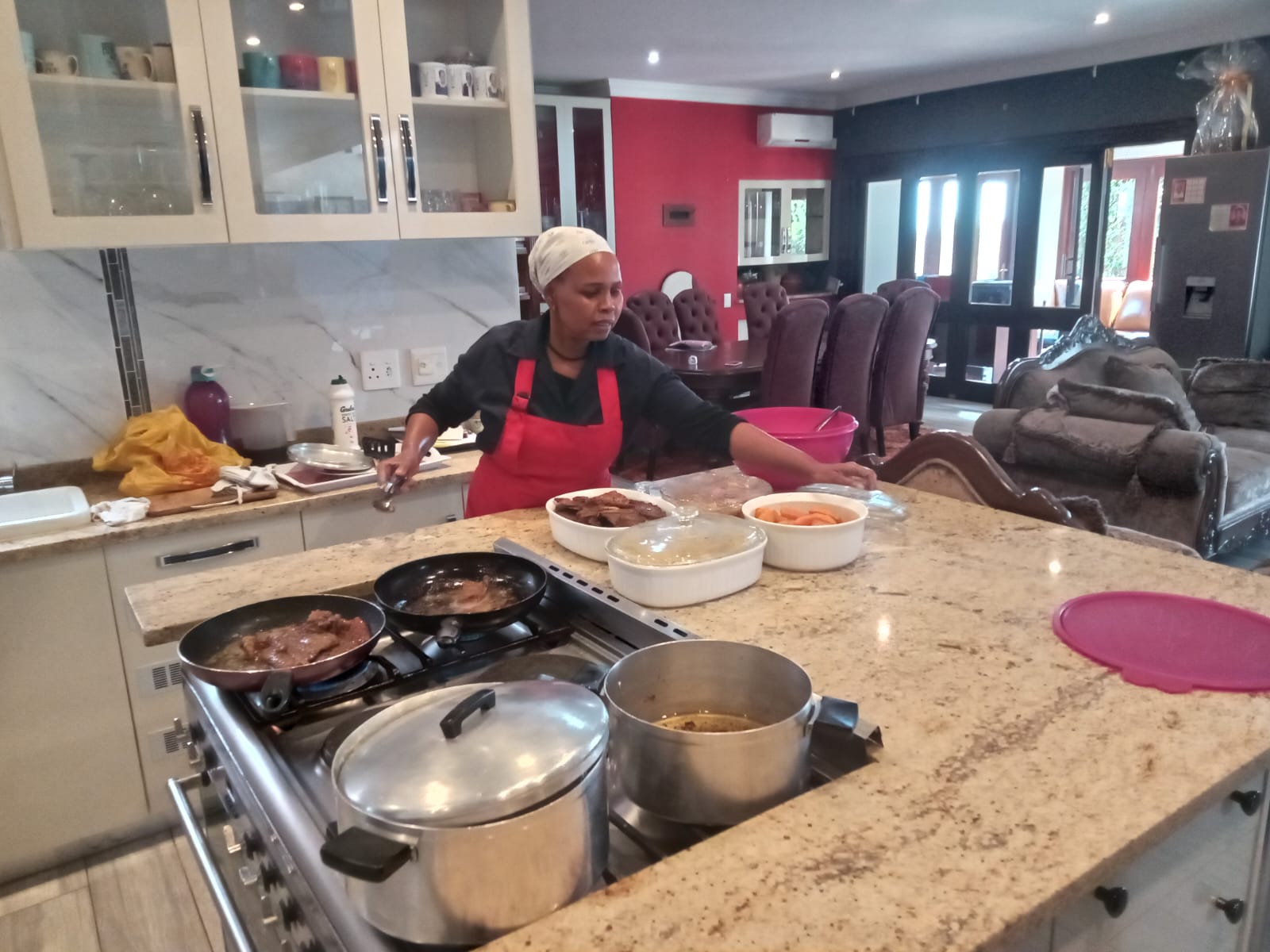Types of dishes cooked: Roast chicken with rice ad veggies; roast beef with rice and veggies; stew beef with samp and potato salad; Lasagne; Mince with macaroni; beef stroganoff; macaroni together with bacon and cheese sauce or white sauce cheese on top and put in the oven for 10 minutes; mix green salad; Papa le malamohodu; different salads; dumpling with chicken; different salads; breakfast like toast bread with frying eggs or scramble egg with bacon; fish and chips with green salad; dessert like malva pudding with castard.